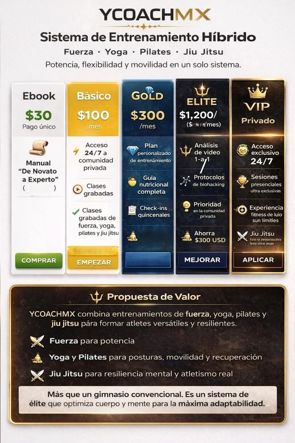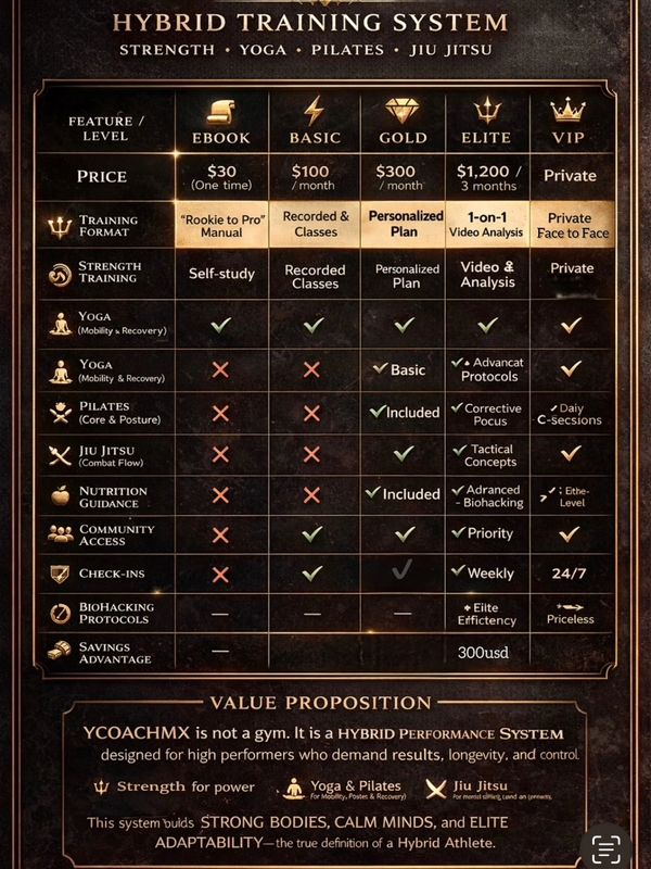 Price: $1,200 (One-time payment for 3 months) Description: Total commitment for a radical physical and mental transformation. Perfect for athletes or high-level executives.